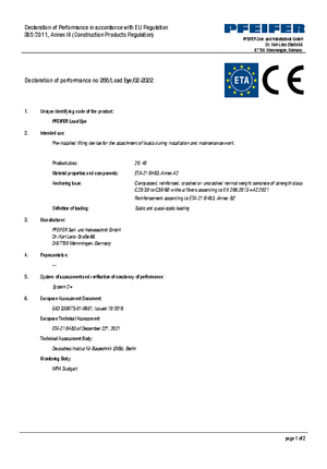 The PFEIFER Load Eye is designed as a cast-in attachment point. It is used in concrete structures for the temporary suspension of materials or work platformas during equipment installation and maintenance work. The PFEIFER Load Eye may also be used an attachment point for personal protective equipment as confirmed by fall tests in accordance with the European standard DIN EN 795:2012. PFEIFER Load Eyes are available in two different sizes: WLL 20 kN (blue) and WLL 40 kN (red). Performance of the system is assessed in European Technical Assessment ETA-21/0483. Detailed description of use is described in the technical catalogue.